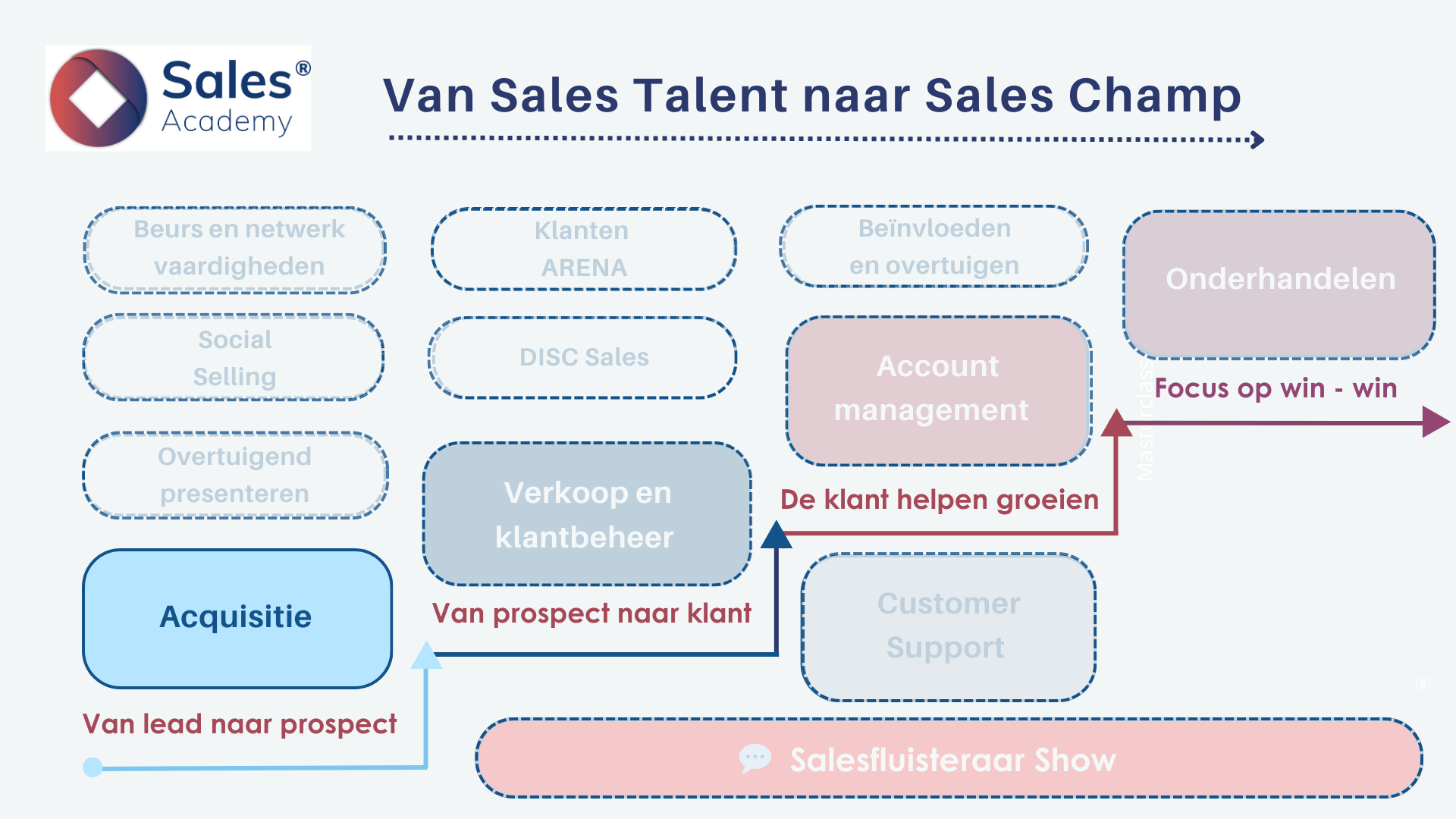 - Bij Sales Academy bieden we de sales theorie aan in behapbare stukjes via ons eigen leerportaal, zodat je de stof op je eigen tempo en op jouw momenten kunt leren.